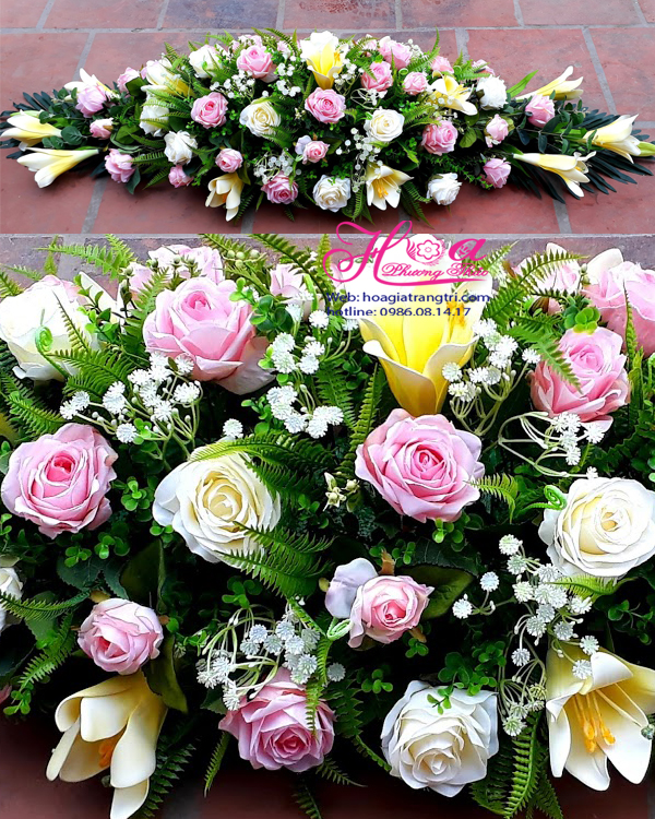 Hoa lụa, kích thước sản phẩm dài 90cm rộng 50cm dùng trang trí bàn họp hoặc để ở bàn khách chỗ  trang trí hạn chế chiều cao.